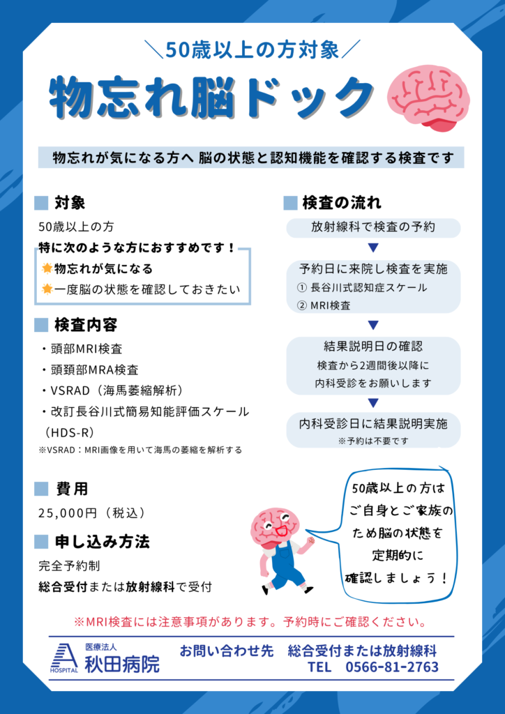 当院では、50歳以上の方を対象とした「物忘れ脳ドック」を開始いたしました。